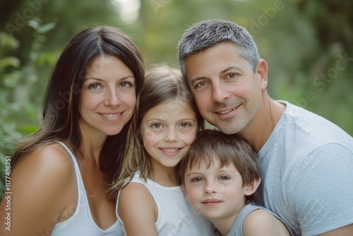 family, portrait, children, children, people, smiling, mother, father, daughter, son, happy, together, outdoors, casual attire, white, grey, green, 2, woman, man, boy, girl, head shot, group, photo