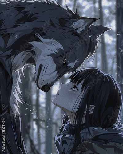 A fantasy illustration of a girl and a giant wolf gazing into each other’s eyes in a mystical forest, under the moonlight.