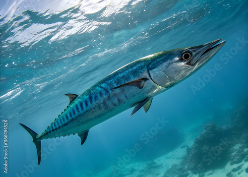 A fast-moving wahoo with elongated body and blue-green iridescent scales