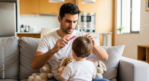 A father gently combs his toddler's hair on the couch at home. A heartwarming family moment filled with love and tenderness. Fatherhood, parenting, family bonding.