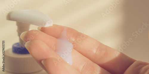 A female hand uses liquid soap with a dispenser. White gel on the human fingers.