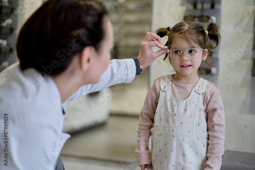 A female optician selects glasses for a girl
