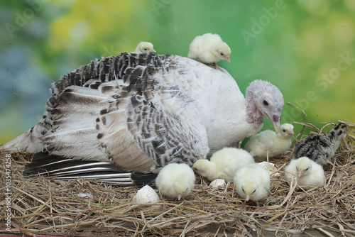 A female turkey lovingly guards her newly hatched chicks in the nest. This animal is commonly cultivated by humans with the scientific name Meleagris gallopavo.