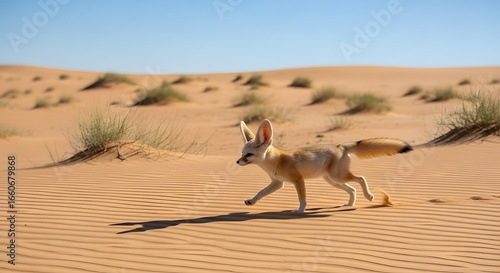 desert, dune, running, animal, wildlife, nature, arid, landscape, mammal, sand, ear, tail, fur, clear sky, hot, dry, outdoors, sunny, daytime, wild, fauna, small, cute, tan, beige, horizon, plant, vegetation, shadow, ripple, carnivore, fox, sahara, africa, wild animal, desert landscape