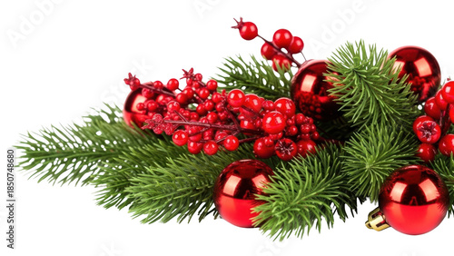 A festive arrangement of red ornaments and berries on fir branches viewed from above on a white background.