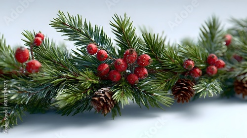 A festive Christmas garland with pine branches, red berries, and pinecones lies horizontally against a light background.