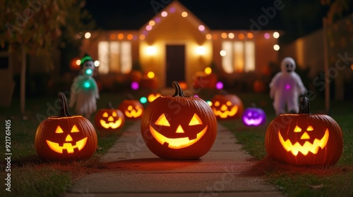 A festive Halloween scene featuring glowing jack-o'-lanterns and playful ghost decorations in a charming neighborhood.