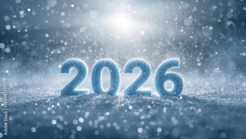 A festive winter-themed New Year image featuring frosted 3D “2026” numbers, glowing script text, and sparkling fireworks against a snowy, atmospheric night.