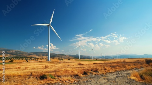 A field of wind turbines with a clear blue sky in the background