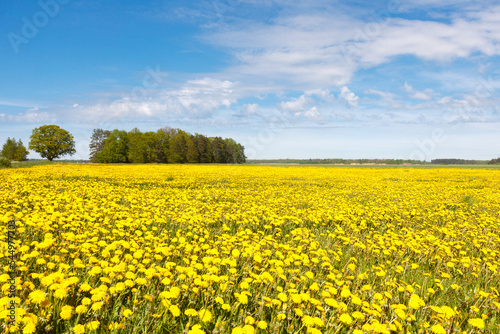 field, land, farm, rural, nature, landscape, spring, green, plant, flower, meadow, grass, season, sky, summer, yellow, blowball, agricultural, countryside