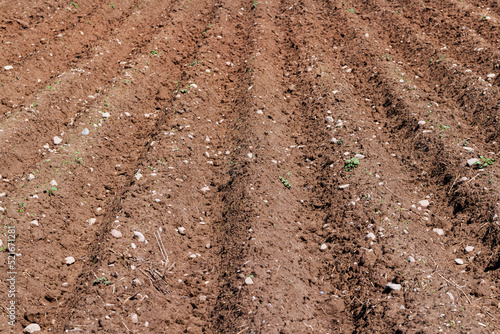 A field with furrows in which potatoes grow