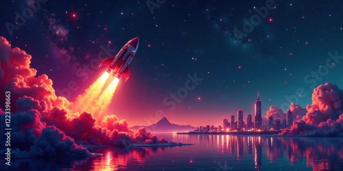 A fiery rocket ascends through vibrant pink clouds, leaving a glowing trail against a backdrop of a starlit night sky and a shimmering cityscape reflected in tranquil waters.