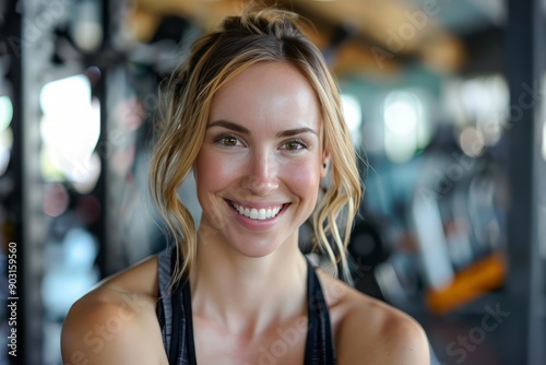 A fit muscular female personal trainer smiling at the camera in a gym, close up