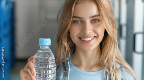 A fit woman carrying a water bottle poses confidently in a sleek locker room, embodying strength and wellness.