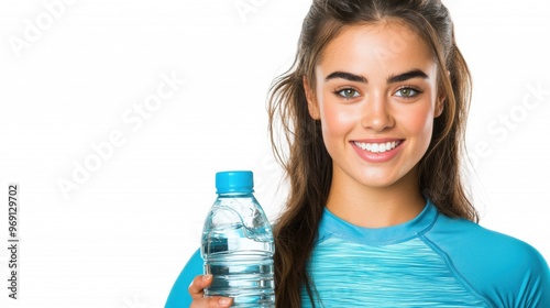 A fitness model with European features, long hair, tight sportswear, holding a water bottle, friendly smile, isolated on white background