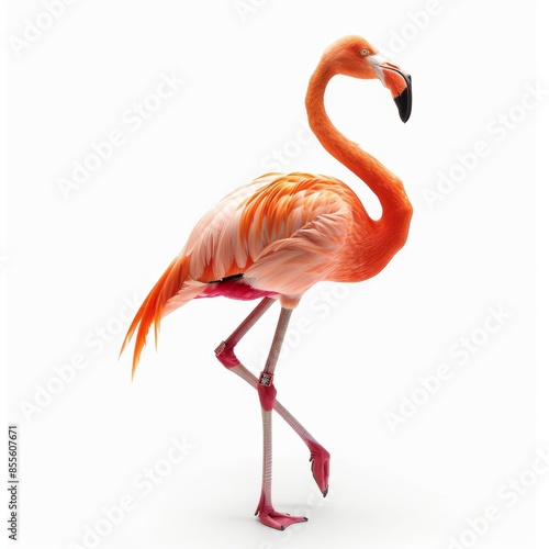 A flamingo standing gracefully on one leg, isolated on a white background