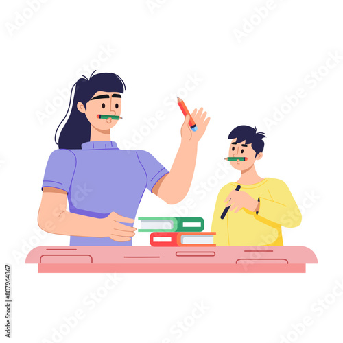 A flat illustration of mom teaching kid