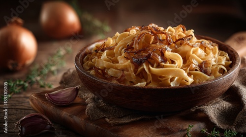 A flat lay of pasta with caramelized onions, rustic warm wood, cozy mood