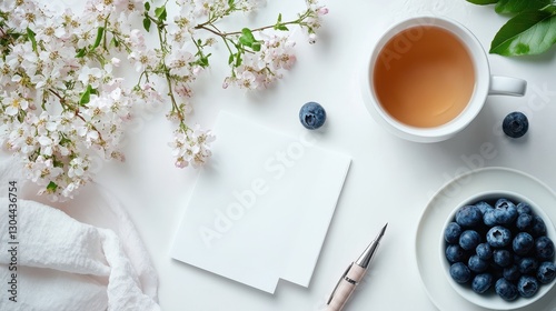A flat lay top view unveils a feminine table adorned with notes, delicate flowers, a stylish pen, and a vibrant cluster of blueberries, all arranged with meticulous precision. A pristine white