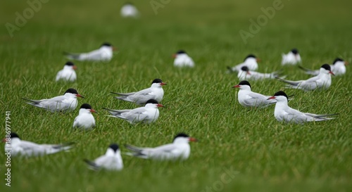 A flock of small white birds with black heads and red beaks standing in a lush green grassy field