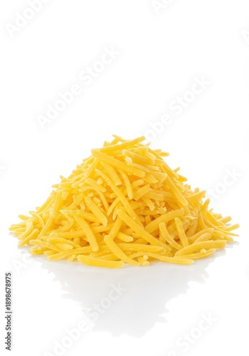 A fluffy mountain of vibrant yellow shredded cheese, ready for culinary use, dramatically isolated on a clean, bright white background, topping, dairy, flavor