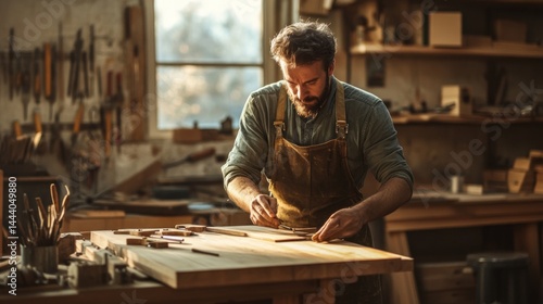 a focused artisan meticulously crafting wood in a sunlit workshop, emphasizing skill, dedication and the timeless art of woodworking, highlighting authentic craftsmanship
