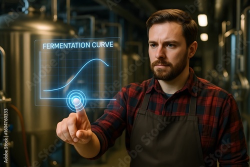 A focused brewery worker interacting with a futuristic fermentation curve graphic. The worker is wearing an apron, and the scene depicts a modern industrial setting