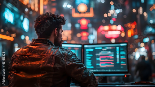 A focused individual analyzes data on dual screens in a vibrant urban nightlife scene