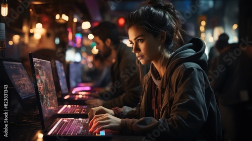 A focused individual engaged in gaming at a cyber cafe, with multiple computer monitors and vibrant lighting