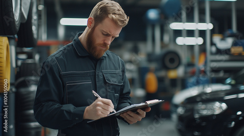 A focused mechanic jotting down notes on a clipboard in an auto shop, estimating repair costs for a customer's vehicle. photo
