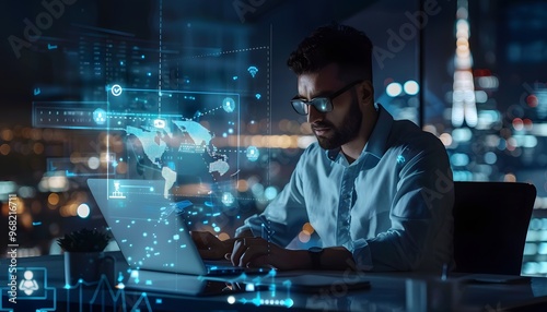 A focused professional working on a laptop at night, with digital graphics representing data and technology in the background.