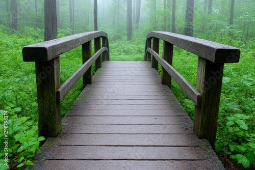 A foggy, mysterious footbridge disappearing into the mist in an enchanted forest