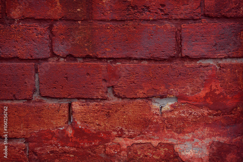 A fragment of a red brick wall with pronounced texture. Natural age defects in the form of cracks and abrasions. Rough surface with traces of dried paint.