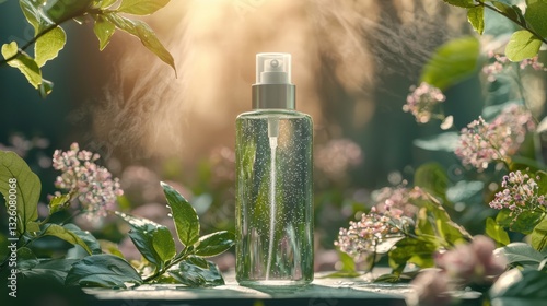 A fresh, dewy skincare scene featuring a misty facial spray bottle with visible condensation, placed against a soft-focus botanical background, no text, no brand