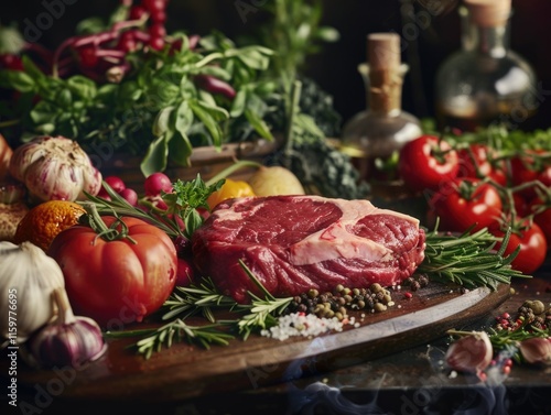 A freshly sliced grass-fed beef cut, ready to be cooked and served with a variety of colorful vegetables. This meal is garnished with fresh herbs and seasonings, highlighting the natural flavors.