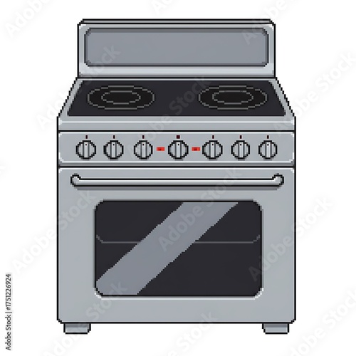 A front-view pixel art illustration of an electric kitchen stove. The stove features two elliptical burners, four control knobs, and a reflective glass oven door set against a solid background.