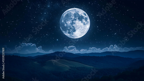 A full moon shines over a misty mountain range with scattered clouds and a starry night sky in a cool dark blue tone