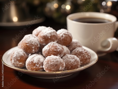A fun and festive Christmas background featuring donut holes and a hot black coffee mug