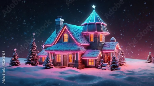 A futuristic 3D Merry Christmas design with neon lights, sleek metallic textures, and glowing snow effects.