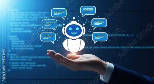 A futuristic ai chatbot interface with a human hand and speech bubbles