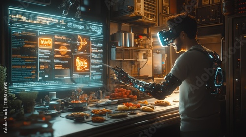 A futuristic chef using VR for cooking, showcasing innovation and technology in modern cuisine.