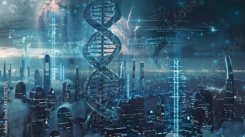 city landscape, building, act, gene, sequence, big, graphic, datum, hologram, virtual, cyber, science, futuristic, digital, abstract, background, technology, effect, future, tech, interface, neon, element, laser