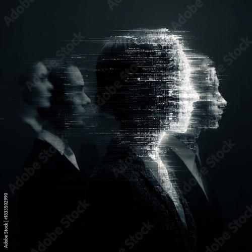 human, digital, identity, abstract, figure, glitch, transformation, technology, society, movement, line, visual, art, interaction, perception, modern, contrast, emotion, depth, perspective, mystery, shadow, metaphor, illusion, future, design, style, datum, creativity, expression, simulation, awareness, evolution, render, communication, concept, exploration, boundary, interpretation, narrative