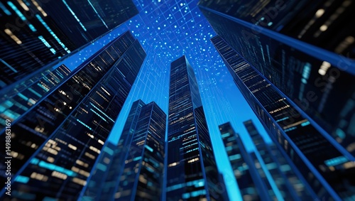 A futuristic digital cityscape glows with code-line buildings and glass textures, stretching under a starry grid sky at a dynamic cinematic angle.