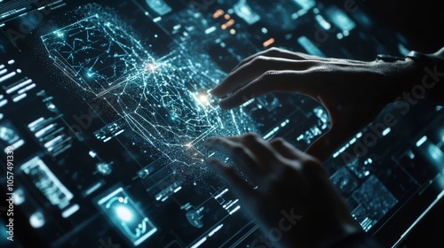 A futuristic digital interface with data visuals and holographic elements, hands interacting with augmented reality, representing artificial intelligence, innovation, and technology advancement