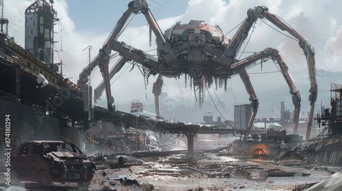 A futuristic dystopian landscape dominated by a towering, spider-like robot, its metallic legs spanning across a desolate, industrial wasteland.