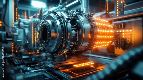 A futuristic engine showcased with glowing elements and intricate machinery, emphasizing advanced technology and design.