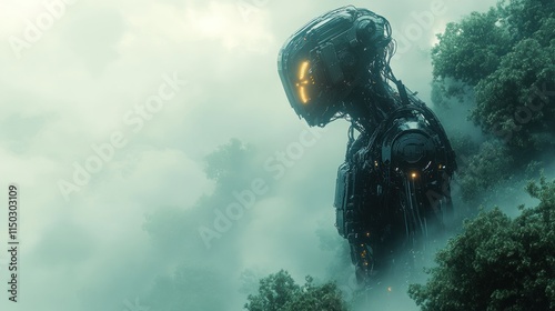 robot, forest, mist, technology, android, futuristic, nature, landscape, environment, design, artificial, intelligence, silhouette, glowing, eerie, science fiction, machinery, metal, giant, serene, atmosphere, innovation, abstract, surreal, shadow, exploration, concept, aethereal, digital, creation, vision, solitude, towering, advanced, organic, structure, aesthetic, mystery, evolution, fantasy, art, calmness, imagination, dream, perspective