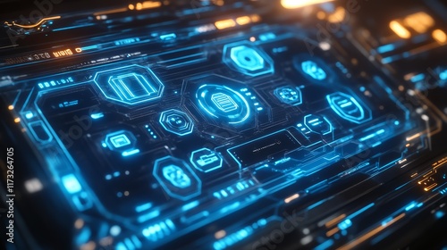 A futuristic interface with glowing blue elements, featuring icons and digital displays, suggesting advanced technology and data interaction.
