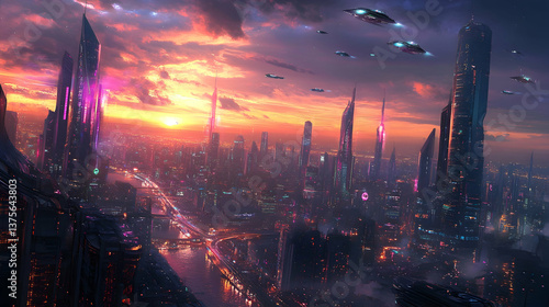 A futuristic metropolis basks in the vibrant glow of a breathtaking sunset, its towering skyscrapers piercing the dramatic sky, while sleek spaceships gracefully navigate the twilight.